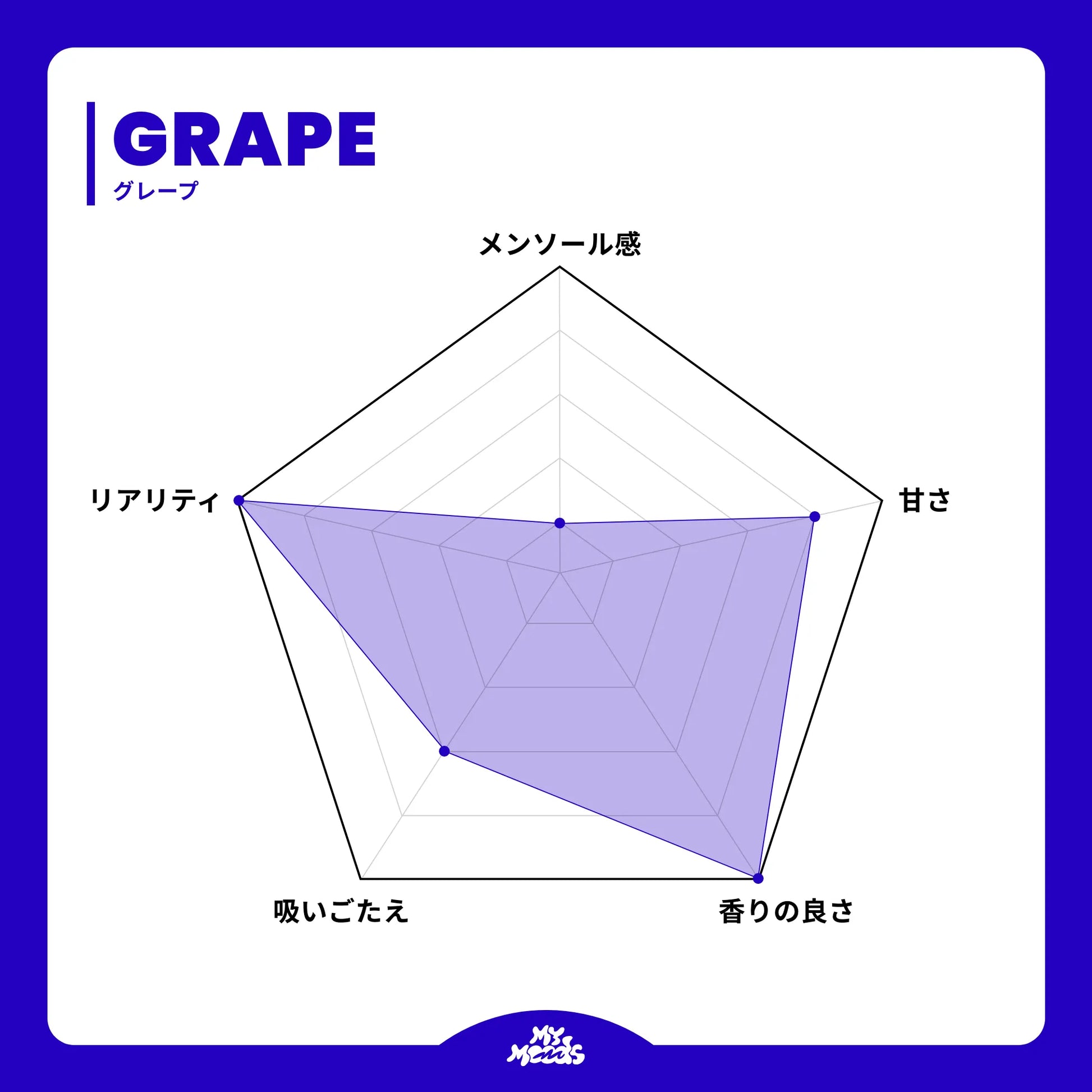 MyMoods VAPEには、グレープやピーチなど定番から、エナジーのようなドリンク系まで、10種類以上の多彩なフレーバーが用意されています。甘く濃厚な風味を楽しめる点も人気の理由のひとつです。気分に合わせてフレーバーを変えたり、自分のお気に入りを探したりすることができ、使う楽しさも広がります。