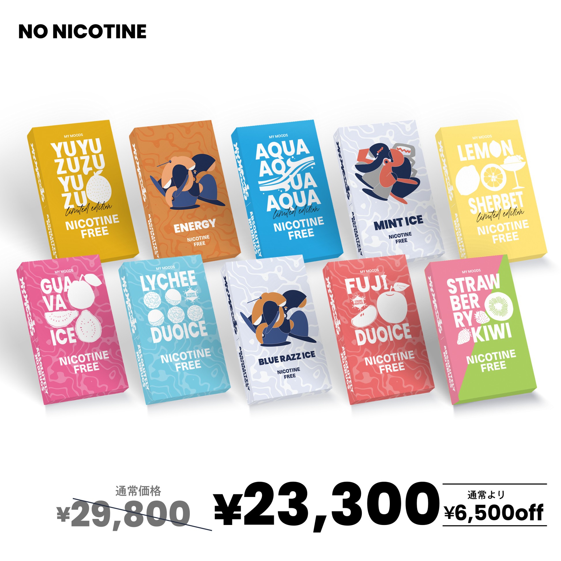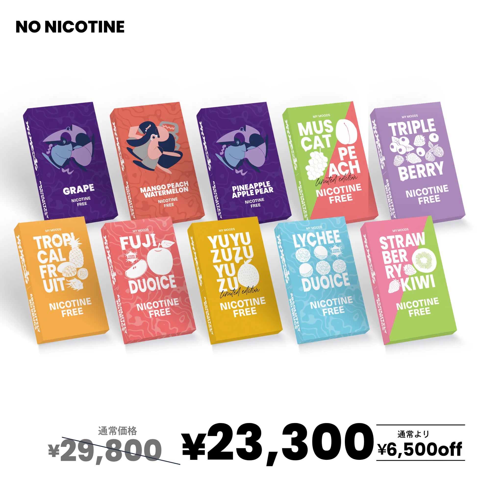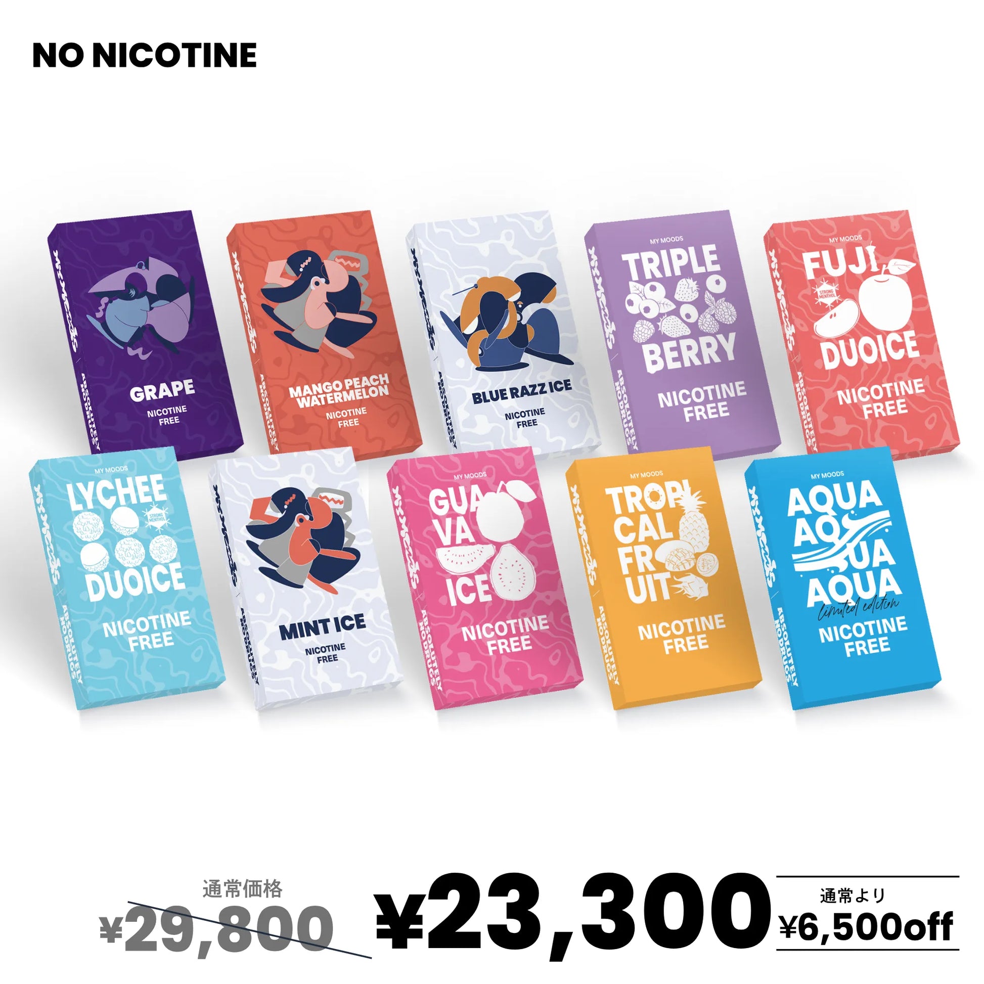 MyMoodsが「Moodを変えるVAPE」をコンセプトに大手香料メーカーと約2年の期間を掛けて開発したPOD型VAPEのノンニコチンPODが29,800円分が入ったお得なセットとなります。