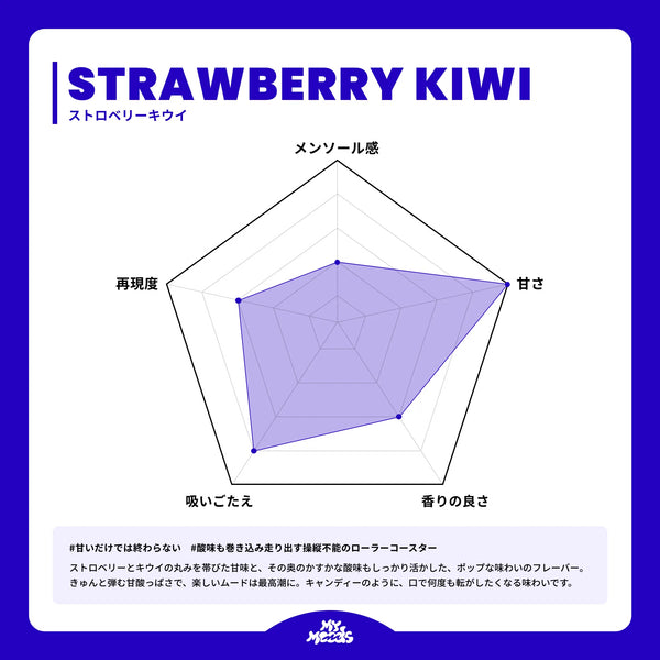 いちごとキウイの丸みを帯びた甘味と、その奥のかすかな酸味もしっかり活かした、ポップな味わいのフレーバー。きゅんと弾む甘酸っぱさで、楽しいムードは最高潮に。キャンディーのように、口で何度も転がしたくなる味わいです。